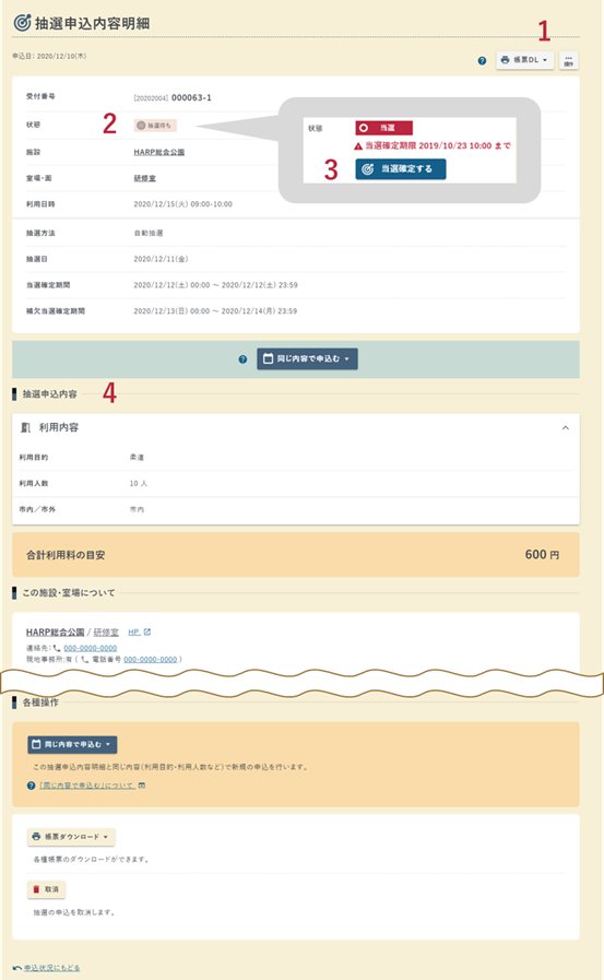 出力できる帳票は施設によって異なる場合があります。 - 抽選申込取消