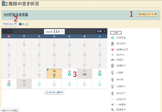 空き状況のみ 空いているので施設指定の方法で予約申込が可能な状態