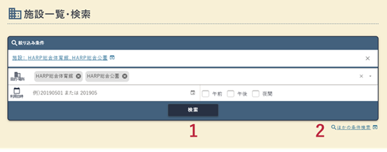利用目的・施設名・利用日時等を入力し、施設を検索します。