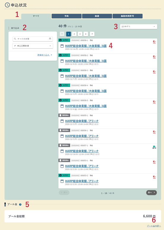 申込済みの予約申込・抽選申込・施設利用許可申込の申込状況の確認が行えます。